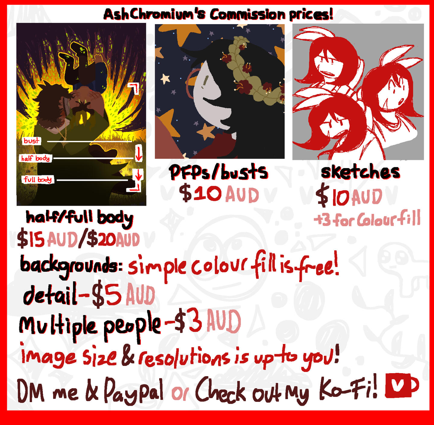 For commissions outside of Ko-fi, half of the commission price must be paid first before I can begin your commission.