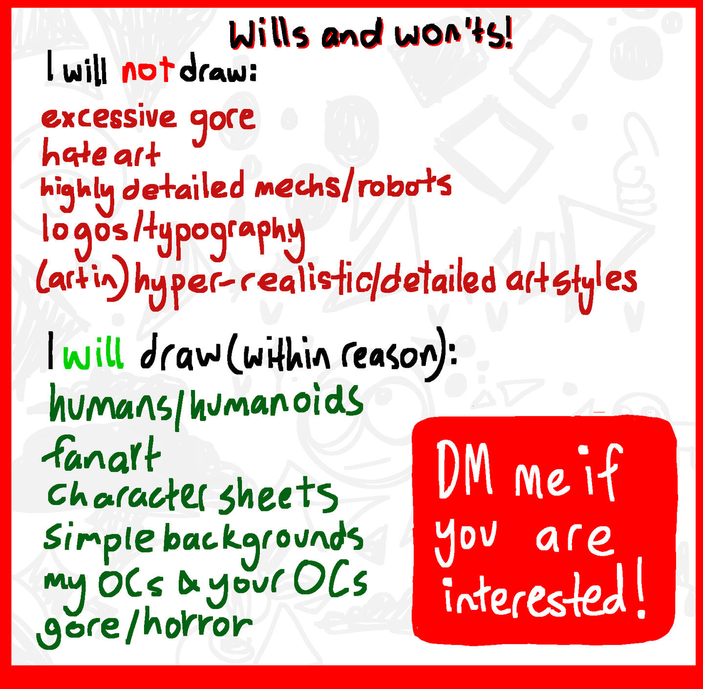 Please describe your requests for your commission clearly and with detail.I may also ask for one or more visual references to clarify any details.Any ill behaviour will not be tolerated and your commission will be cancelled if it occurs.My commissions will be made on whether I can uphold the quality of your request and if you follow the rules provided.I will not draw:excessive Gore